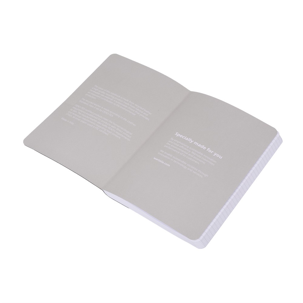 A5 Notebook, soft cover in dark blue recycled Oeko-tex leather with debossed Wärtsilä logo on front cover.  Grey elastic band for closure. The soft cover and flexible spine makes it possible to open up the notebook completely.
