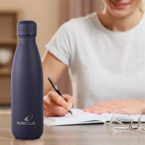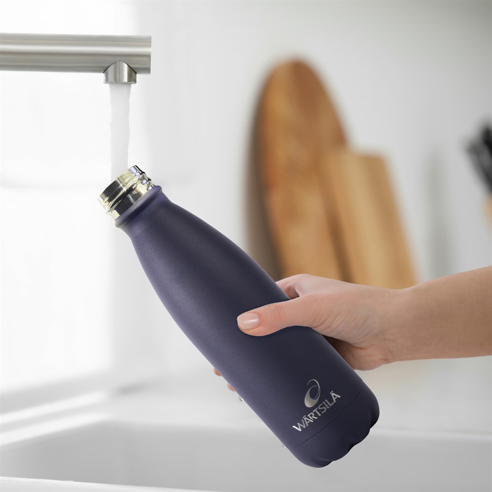 Dark blue powder coated bottle with Wärtsilä engraved logo. Each bottle is delivered in Wärtsilä packaging with care instructions.