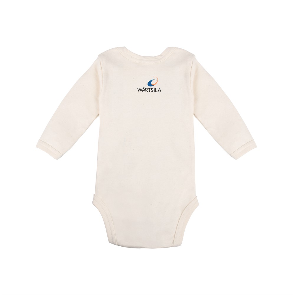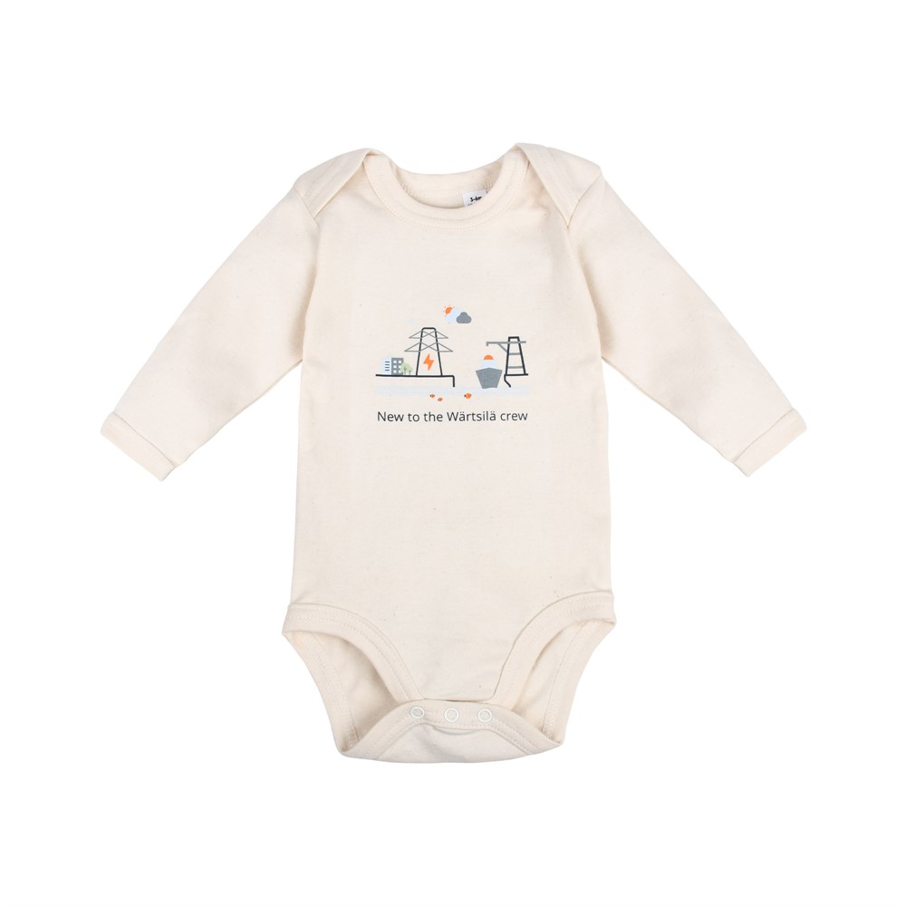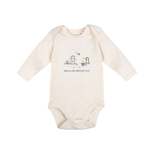 Long sleeved Baby Body in neutral white Organic Cotton. Envelope style neck opening, long sleeves with binding at sleeve ends for shape retention. Nickel-free snap buttons by leg opening to simplify dressing. A super cute Wärtsilä illustration that shows both power and marine sector at front with the New to the Wärtsilä Crew text and Wärtsilä 3-color logo at back. A perfect gift to parents with a newborn.